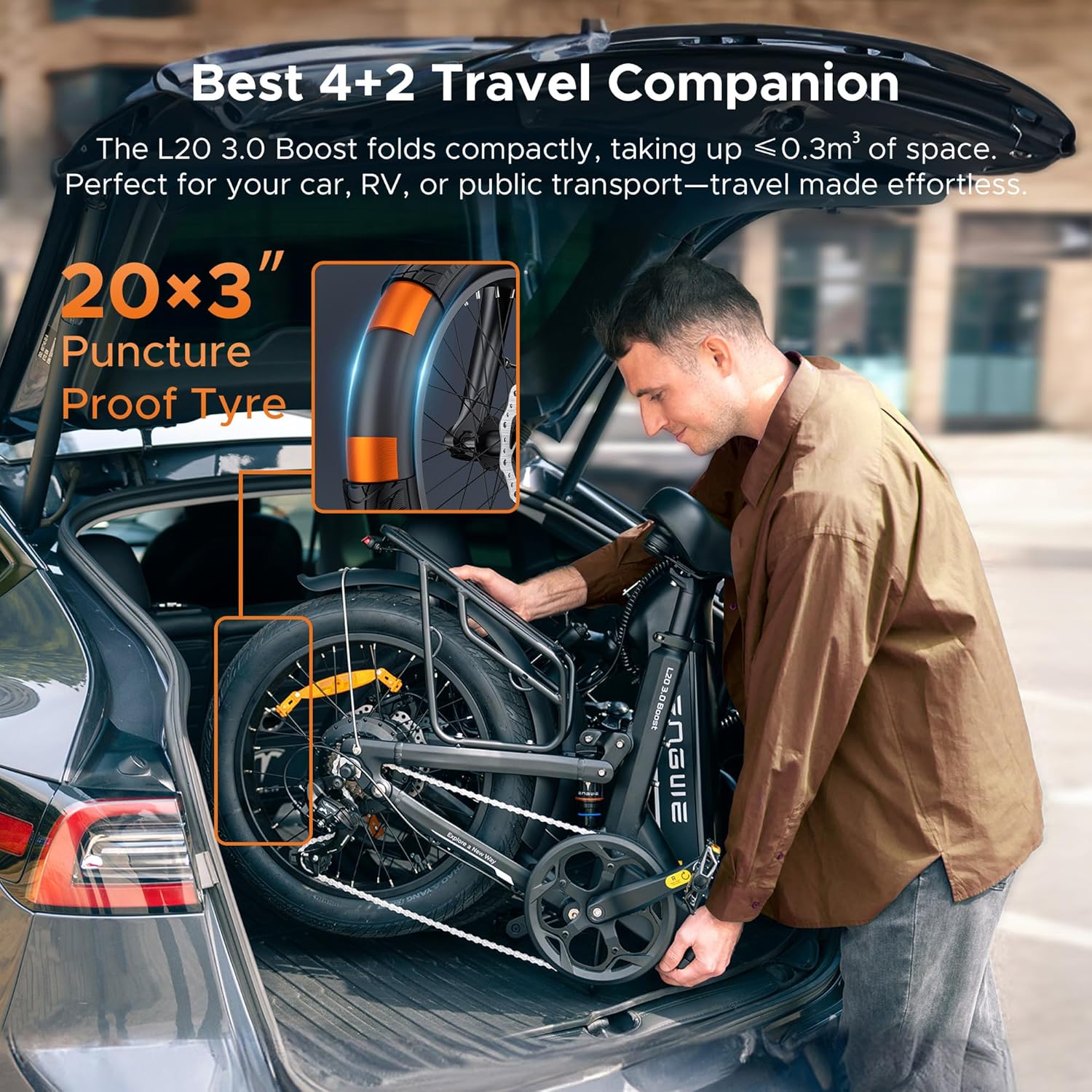 L20 3.0 Boost składa się kompaktowo, zajmując ≤0,3 m³ przestrzeni, co ułatwia przechowywanie. Idealny do podróży 4+2, bezproblemowo mieści się w samochodzie, kamperze lub transporcie publicznym, dzięki czemu każda podróż jest bezproblemowa.